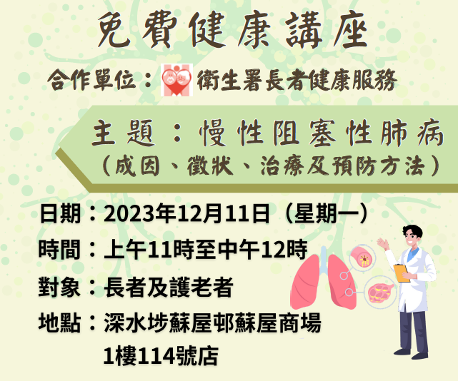 28 11 月, 202328 11 月, 2023免費健康講座 - 12月份主題(慢性阻塞性肺病)本中心於12月30日(星期一),上午11時至中午12時,邀請到衛生署在蘇屋商場114號店舉辦免費健康講座,12月份主題是慢性阻塞性肺病,歡迎長者及護老者參與。有興趣參與的長者可以親臨本中心 / 致電2368 3100 / Whatsapp 9611 1372 與本中心職員報名。